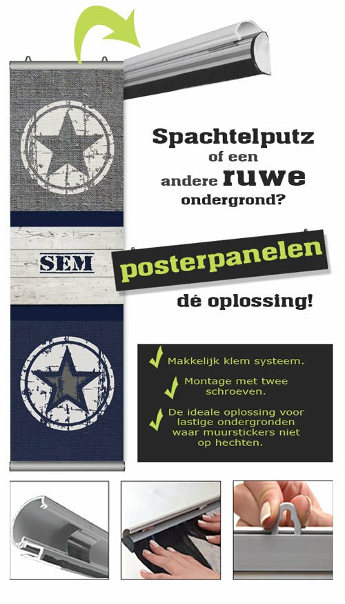De posterpanelen van Kleefenzo zijn speciaal ontwikkelt voor muren waar muurstickers niet blijven plakken. Dus heeft u in de kinderkamer of babykamer bijvoorbeeld een spachtelputz muur zijn of een muur met ruwe structuurverf of glasvezel? Dan zijn posterpanelen de oplossing! De posterpanelen zijn gemaakt van topkwaliteit materiaal en hebben een stoere canvaslook. De montage is heel makkelijk: het posterpaneel wordt geklemd tussen twee aluminium profielen. Dit ziet er niet alleen mooi uit, maar het bovenste profiel biedt ook gelijk de mogelijkheid om te monteren met twee schroefjes in de muur. Kortom: Posterpanelen zijn de ideale oplossing voor structuurmuren en het alternatief voor muurstickers in de kinderkamer of babykamer. Klik hier voor meer informatie over de posterpanelen.
